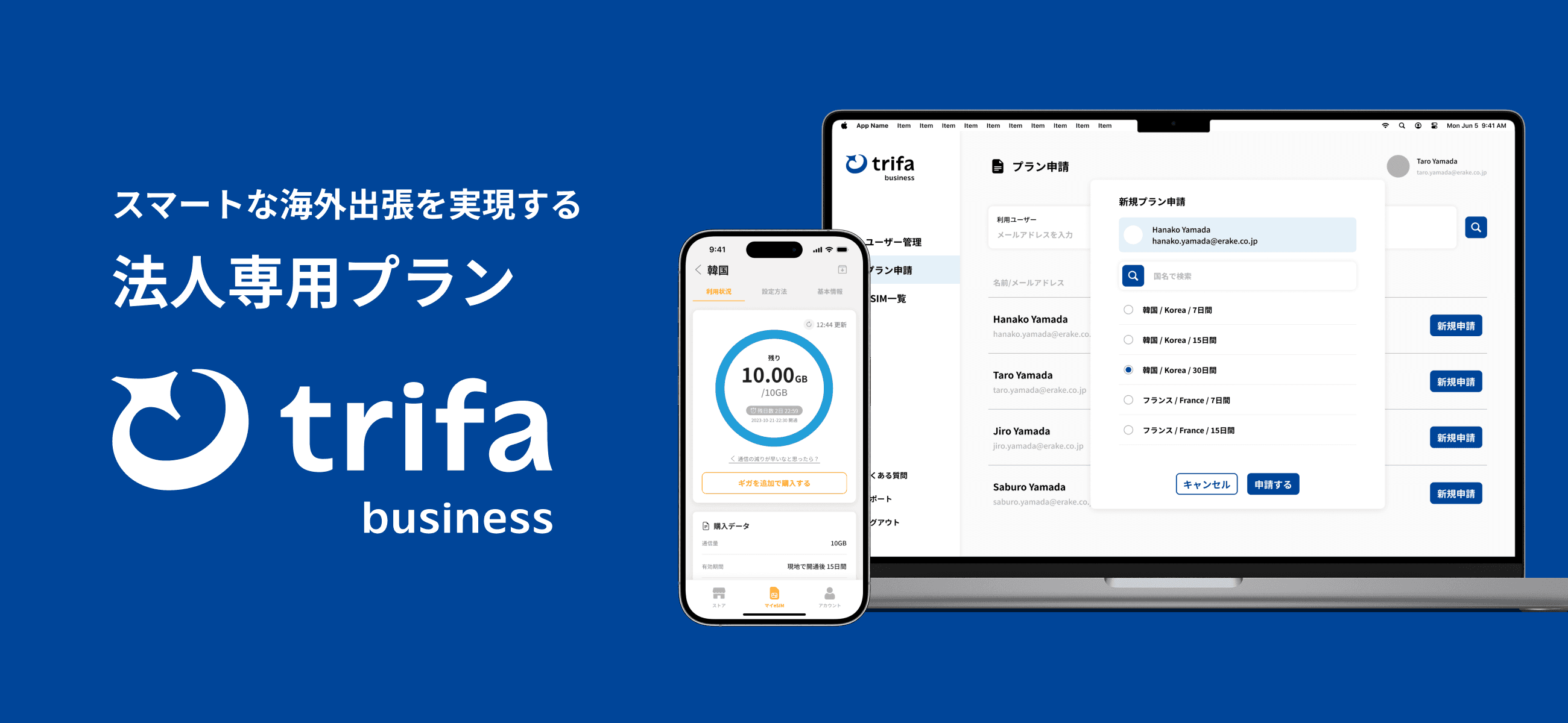 株式会社ERAKE(本社:東京都品川区西五反田7丁目23番1号、代表取締役:嘉名雅俊)は、海外渡航者向けeSIM通信サービス「trifa」において、新たに法人向けプラン「trifa Business」を提供開始いたします。