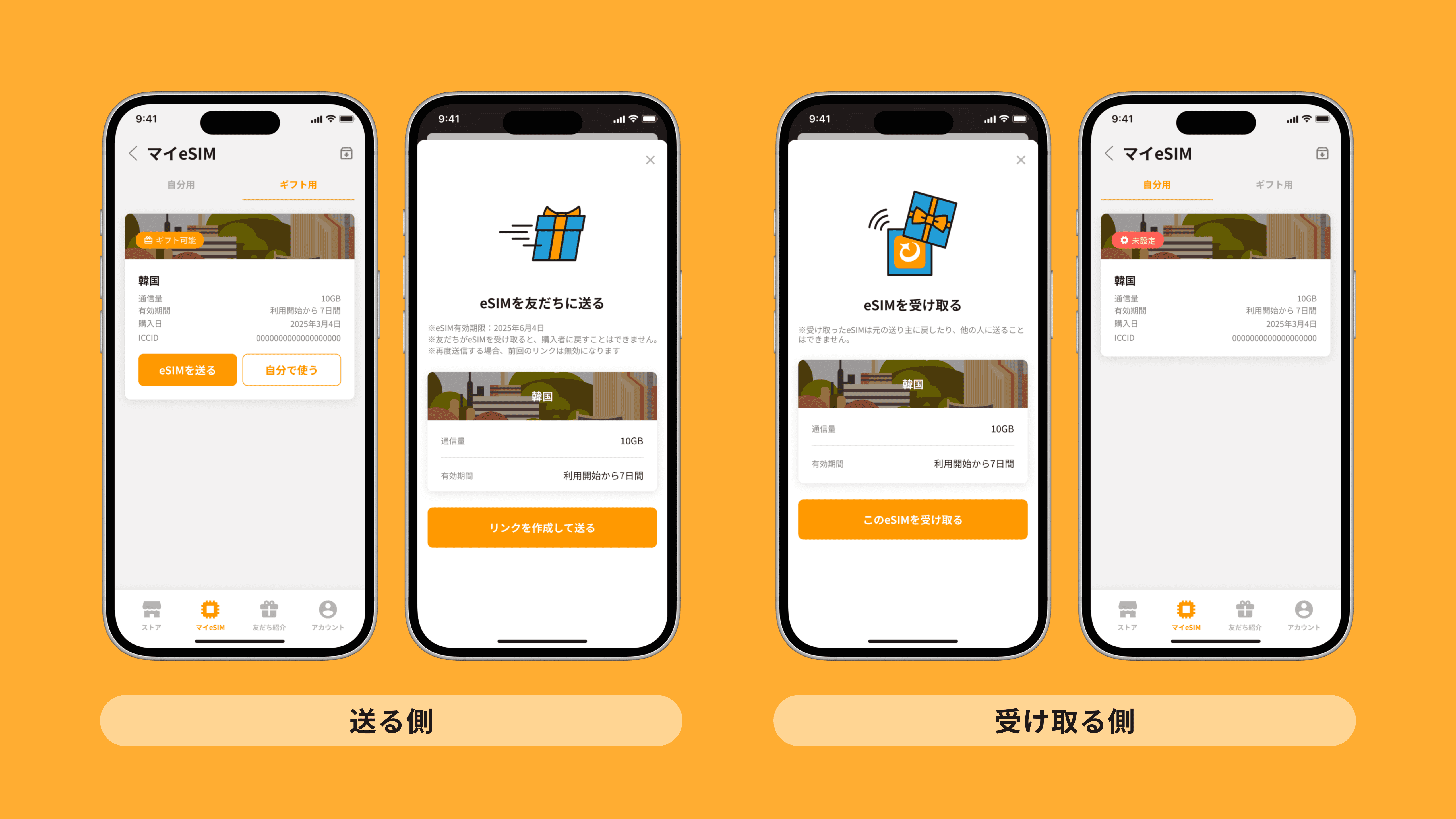 まとめて購入したeSIMのうち1つは自分用として利用し、残りは友だちや家族に専用リンクを送るだけで簡単に渡すことができます。