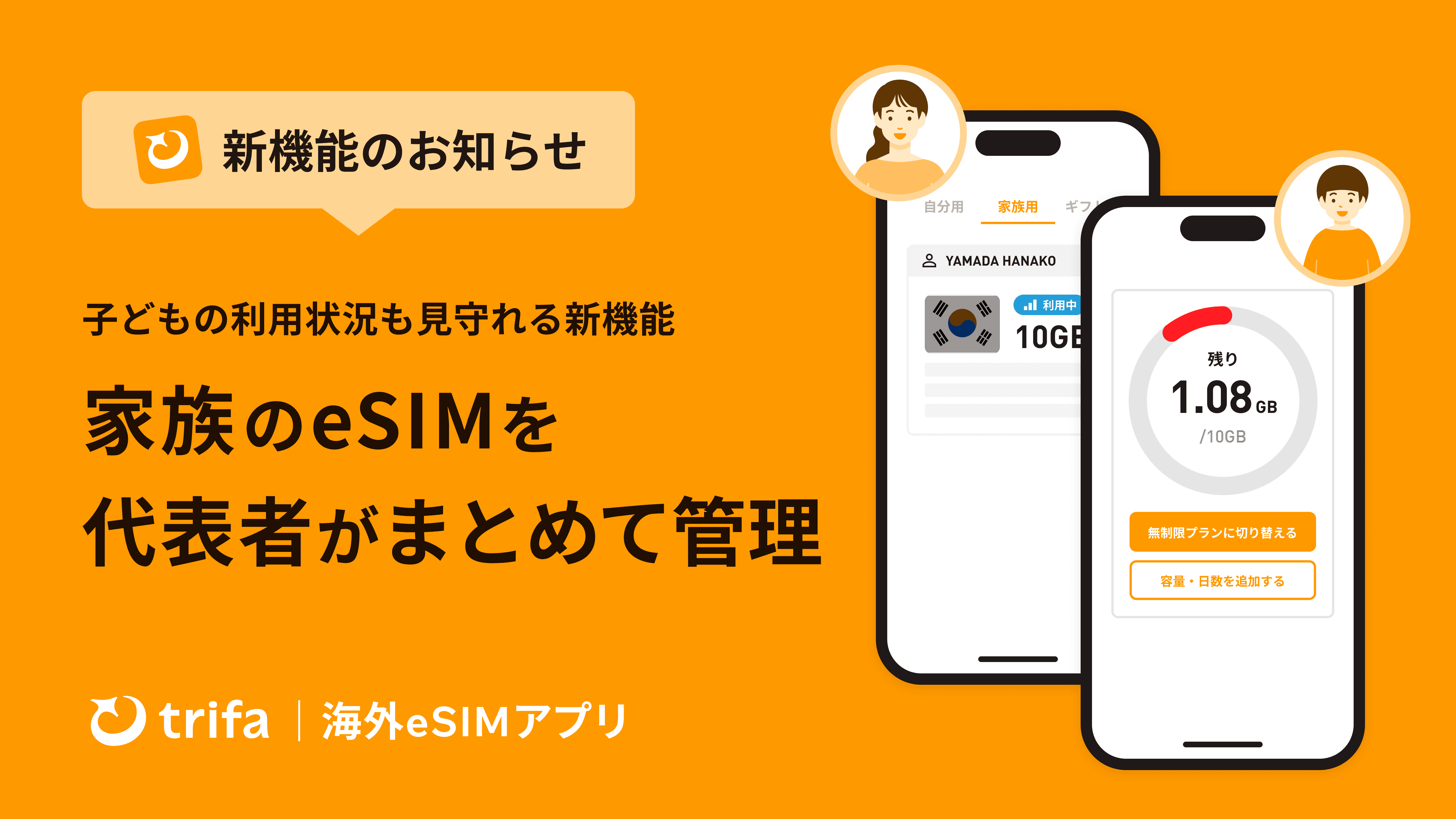 株式会社トリファ(本社:東京都品川区、代表取締役:嘉名 雅俊)は、海外eSIMアプリ「トリファ」にて、家族のeSIMを購入し、利用状況やデータ残量をアプリから確認できる「家族アカウント管理機能」を提供開始しました。代表的な利用シーンとして、お子さまの留学や修学旅行の際に、保護者が子どものeSIMを準備・チャージし、利用状況やデータ残量をアプリから見守る使い方が可能です。家族側のアカウントに支払い情報を登録する必要がなく、離れて暮らすご家族の海外渡航や、家族旅行など、さまざまなシーンで安心してご利用いただけます。